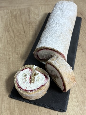 Vychladlý plát okrojíme, namažeme malinovou marmeládou (recept případně nasdílím, dejte vědět 😊), a poté do tuha ušlehanou šlehačkou s vanilkovými zrníčky. Nakonec posypeme nahrubo namletými pistáciemi. Zabalíme a před krájením necháme alespoň hodinu vychladit v lednici.